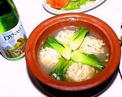 豚肉を叩いて勾玉状にしたものを魚肉から作ったワンタンの皮のようなもので包んだものがスープに浮いています。