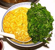 - 炒めた豆苗(えんどう豆のわか葉)に上海蟹の味噌と卵と身から作った蟹粉を取り合わせたもの。