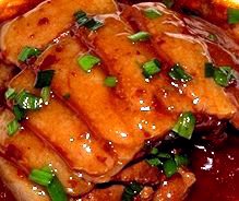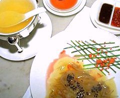 - フカ鰭の姿煮の上に黒魚子(キャビア)をあしらったもの。