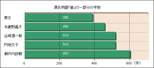 これを見ると、新しい現代語訳が出るたびに字数が長くなっているのですね。瀬戸内訳では、じつに原文(角川文庫版)の1.5倍だ。これはちょっと勘弁してほしい。