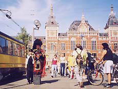 ![]() ホテルに荷物を置いて町に出る アムステルダム駅を背に アイルランドのバグ・パイプのお兄さんと 一緒に一枚 |