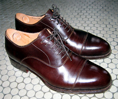 ボノーラのストレートチップその後、靴ブームのような状況となり、いろんな雑誌も靴を特集して銀座堂のような地味な名店にもスポットがあたることが多くなっているような気がいたします。で、それらの雑誌や本を見て私はボノーラがものすごく気に入りました。とくに「紳士靴入門」(竹川圭・文、平凡社刊)に載ってたボノーラがすごく美しくてすっかりお気に入りに。以後、いつかボノーラを買いたい、買いたいと思っていたらビームス阿倍野店に置いてあって、おお!いつか買おう、買おうと思っているうち数ヶ月が経過。である日、銀座堂に白のローファーでも買おうかと向かってみたらそこにボノーラが置いてあったんですね。茶と黒とストレートチップ。店のおじさんのお話では2003年夏からはボノーラも扱っているとのことでした。おじさんが何度も「いいよーこれはすごくいいよ」と呪文のように繰り返すので結局、買ってしまいました。実際、履いてみるとすごく履き心地もいいし見栄えもいい。