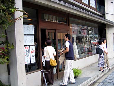 一澤帆布の店頭。すごい人だかりでしょ。最初、一澤帆布のかばんに興味を持ったのは96年ごろでして、毎日、京阪特急で大阪から出町柳まで通勤していたとき、車内の京都女子大の学生さんがよく、この一澤帆布のかばんを持っていたんですね。ひょっとしたら学校指定になっていたのでしょうかね。で、この漢字四文字の堅い雰囲気とハンドメイドの雰囲気あふれる帆布かばんのムードが妙に記憶に残ってしまったのでした。いずれ訪問して何かイイかばんを買ってみたいな、と思ったまま、最近まで訪問したことがありませんでした。その後、東京に行くと結構、オシャレな街の中でこの一澤帆布製のかばんを持って歩いている人を多く見かけるようになり、「なぜ」と驚くとともに一澤帆布ブームなるものの存在を実感したこともあります。