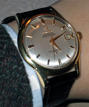 オメガ コンステレーション(1960年代モデル)時計屋さんはその一週間後、オメガのアンティーク腕時計を5個も持ってきて下さったのです。本に載っていた腕時計と同じものはなかったのですが、シーマスターだけでなくオメガのシンプルなフォルムの他機種もお持ち下さりました。