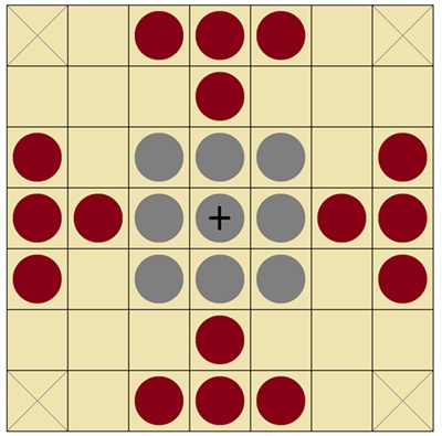 駒の構成がアンバランスで、目的も異なる2人用のゲーム。 盤は7×7で、攻撃側の駒は12個、防御側は王1個、兵8個の計9個。 交互に一つずつ駒を動かす。駒は縦横に複数マス動ける。駒を飛び越すことはできない。