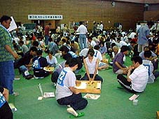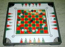 正方形の盤を用い、木製の円盤を指で弾いて敵方の駒を落とす遊び。