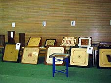 4人で向き合った2人が組み2対2で行う。また2人でも行える。 まず双方の駒を中央に並べる。 その後順番に円盤を指で弾いていく。盤の四隅に穴が空いており、 弾いた円盤をぶつけて、そこに相手方の駒を落とせば再度弾くことができるが、 失敗すると次のプレイヤーの番になる。 早く相手の駒全てを落としてしまった方が勝ちとなる。 または、点数で計算する方法もある。 日本では、滋賀県彦根市で伝統的に遊び継がれており、大会も開催されている。。 |