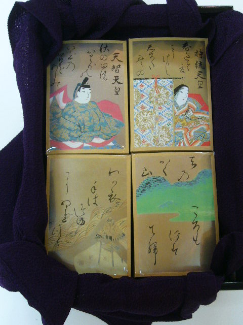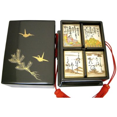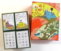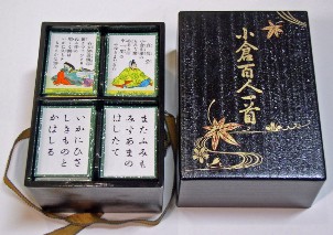 藤原定家が編纂した小倉百人一首を一首ごとに読み札と取り札を作ったもの。本来百人一首とは百人の人間の歌を一人一首ずつ集めた歌集のことであるが、この小倉百人一首があまりに有名であるため、通常百人一首といえば、小倉百人一首を指す。