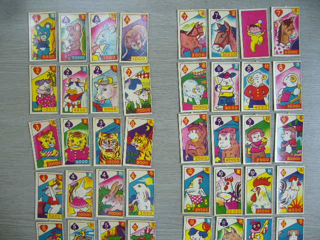 十二支の動物がそれぞれ4枚ずつある遊戯札。子供向けの駄菓子屋玩具として発売された。 遊び方は花札の花合わせと同じで、一人に7枚ずつ配り、山札の周りに6枚表にして開始。 手札から一枚出して山札をめくり、同じ動物を合わせて取る。 札に点数が書いてあり、最後に取った札の点数の合計が最も多い者が勝ち。