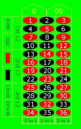番号 賭け方 チップの置き方 配当 1 1点賭け 一つの数字の上に置く 36倍 2 2点賭け 2つに数字の間に置く 18倍 3 3点賭け 横一列の左端に置く 12倍 4 4点賭け 4つの数字の中央に置く 9倍 5 5点賭け 一番上の左端に置く 7倍 6 6点賭け 横2列の中央左端に置く 6倍 7 12点賭け(大中小) 1〜12,13〜24,25〜36の枠の一つに置く 3倍 8 12点賭け(列) 縦一列の一番下に置く 3倍 9 偶数奇数賭け EVEN(偶数)かODD(奇数)の枠に置く 2倍 10 赤黒賭け RED(赤)かBLACK(黒)の枠に置く 2倍 11 大小賭け 1〜18か、19〜36の枠に置く 2倍