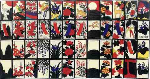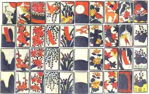 花札と言うと、デザインが決まったもののように思われがちですが、 以前は様々な会社が独自のデザインの花札を販売していました。現在は会社も少なくなり、デザインもほとんど統一されてしまっています。 「百円」(任天堂) 「花の山」(任天堂) 「東山」(任天堂) 「春」(大石天狗堂) 「天狗」(日本娯楽) 「豊太閤」(大日本トランプ) 「太陽」(東洋骨牌) 「山田」(玉水堂) 「王将」(エンゼルトランプ) 「丸十」(山興) 「ハワイ花」 「金時花」(大石天狗堂)