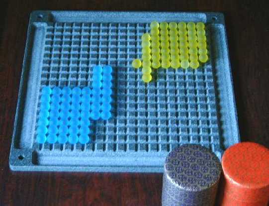 2人用ゲーム「グラスパールゲーム」を紹介致します。 溝の付いた盤上に綺麗なガラス球を並べてゲームをします。 プレイヤーは一列の玉を同時に動かすことができます。動ける条件は動いている列の中の味方の玉 が常に隣の列の味方の玉と1個以上接していることです。早く味方の球が敵の本陣(角の目)に着 けば勝ちです。 http://www42.tok2.com/home/glasspearlgame/からPCとの対戦ソフトを無料でダウンロードできます。 (徳永英司様)