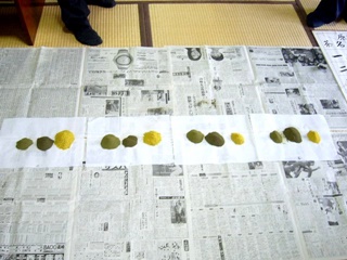 一口含むと茶の苦さと甘茶の甘さが広がる。最も甘くない茶ではないとは思うが、どの程度に甘い茶かというと、これはわからない。見当をつけて和紙を折る。 かかりが順番に席の名前を読み上げる。呼ばれた者は自分の選んだ番号を読み上げる。一つの茶に対して、一番から客まで4種類出揃うのが面白い。