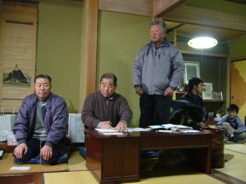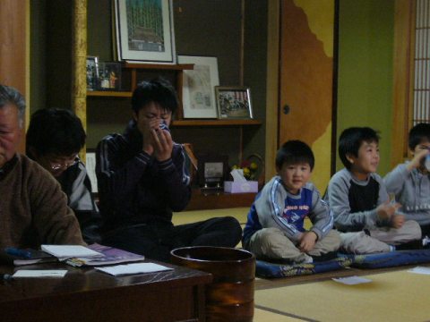 お茶講の家はバス停から3分ほどのところにあった。茅葺きの大きな家である。中では何人かの人間が囲炉裏に当たっている。上がり込んで火に当たらせてもらうと、地元の人のほかにも何人か見学にている人がいることが分かった。 地元の人に話を聞くと、お茶講は元々白久保の集落の家家の持ち回りで行っていたのだが、広い部屋を持つ家が少なくなったため、20年ほど前にお茶候の家を建てたとのことであった。