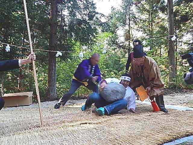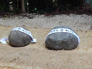 福島県須賀川市の菅船(すがふね)神社礼大祭の中で行われる石持ち上げの行事。 須賀川市は福島県南部の市だが、菅船神社はその東端。小塩江(おしおえ)地区にある神社である。市内中心部から小塩江地区まではバスの便がなさそうなので、須賀川市内ではなく、その北側の郡山市に泊まり、水郡線で小塩江へ。短いホームに簡易待合室があるだけの質素な無人駅である。国道を5分ほど歩き、横の山道へ。5、6分歩くと一つ山間の道路に出た。田畑が続くのどかな光景である。澄みきった青空に一本の幟が立っているのがわかる。目指す菅船神社礼大祭の幟である。近くには車がたくさん停まっている。大祭はもう始まっているようだ。細い細い参道を登って行くと、高いところに菅船神社はあった。中では裃姿の大人たちと巫女装束の少女たちが座っており、神事が行われていた。境内の一角には注連縄が張られ、中に筵が敷かれ、その上に2個の石が置かれていた。これから行われる持ち上げに使われる太郎石と次郎石である。太郎石は100kg弱、次郎石は約30kgとのことであった。その前には台が置かれ、上に賞品とおぼしき一升瓶と菓子などが置かれている。その横にはノートと鉛筆が置かれ、参加したい者が名前を書くようになっていた。