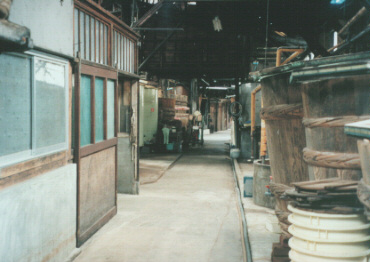 樽の近く 仕込みの樽の辺りです。右に二つほど樽が見えます。手作りの大きな樽で、今ではなかなか手に入らないようです。 左の扉が開いている部屋は、醤油を瓶詰めしてラベルを貼る部屋です。それではさらに進んでみましょう。