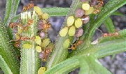 茎に体長1mm程度のアブラムシが寄生し始めました。また、アブラムシの体液を吸いに2mm程度のアリも集まっています。 アブラムシとアリ