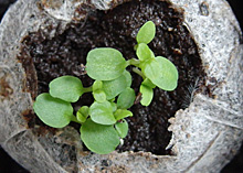 生育の速い株は子葉を展開し始めました。2枚で4oほどの小さな子葉です。発芽から子葉展開まで約1週間と思ったより時間がかかりました。 |