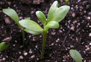 早いものは本葉を展開し始めました。若干、徒長気味になってきましたが、株はしっかりしています。 培土の表面が乾いたら底面給水による潅水を行っています。 |