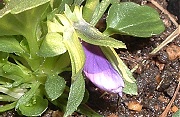 | 直径30cmの浅底プランターの中心にひと株植えつけました。 他の株も順次、大きくなり次第ハンギングバスケットなどに定植する予定です。 定植した株はすでに紫色の花弁が見えていますが、最近の低温の影響で開花までに時間がかかっています。 |