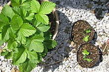 ランナーから発生した子株を3号ポットに採る準備をしました。子株からはまだ根は発生していません。