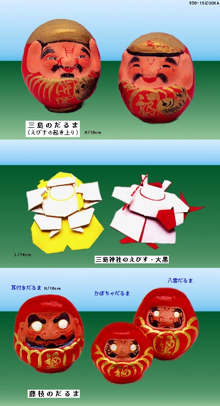 ■三島のだるま■ 三島市でだるまが多く作られています。掲載の「えびすの起き上り」は、かって作られいた面白いものですが、現在は作られていません。 ■藤枝だるま■ 藤枝市で作られるだるまは、小泉八雲の「乙吉の達磨」で、藤枝だるまとして国際的にも知られるようになりました。「八雲だるま」は小泉八雲にちなんだ名称です。 ■三島大社のえびす、大黒■ 折り紙で作られた、珍しい護符です。同じ折り紙式の入れ物に、この2体を入れて社務所で授与しています。 |