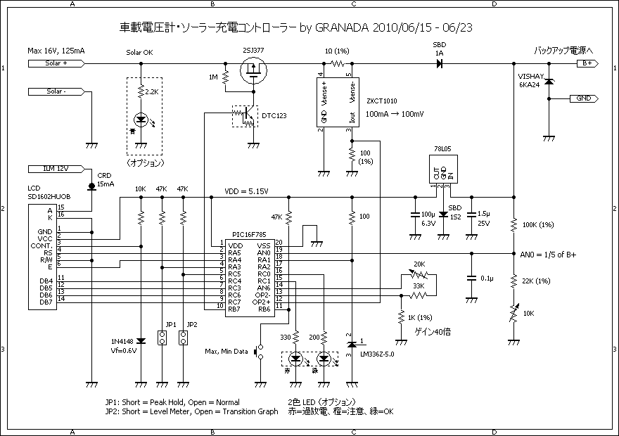 が。ただの電圧計なら機能豊富で安価な市販品が多数出回っているし、先人達による車載電圧計の製作例は極めて豊富。ありきたりなものを作っても面白みが無い。そこでひとヒネリして太陽電池で補充電できるよう、充電コントローラー機能も持たせてみた。