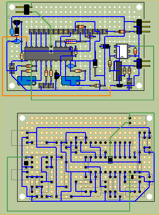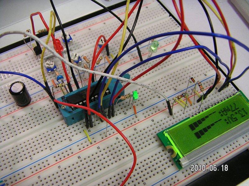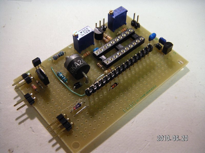 | 製作途中の表面。LCD は最後に 中央のピンに直接ハンダ付けする。 基板中央の筒状の部品 (6KA24) は 24V カットのサージアブソーバー |