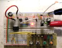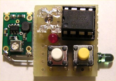 調光モジュールと 昇圧コンバーターと組み合わせて実装。 点滅するのは超高輝度の角型赤 LED。 丸型の赤 LED は圧電ブザーの代わりで、 動作状況モニタ用 |