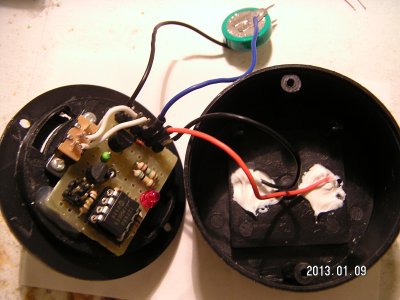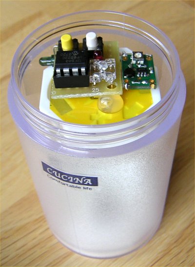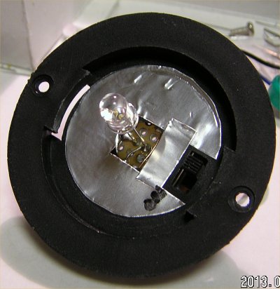 なおこの醤油さしに単一電池を入れるにはタミヤの電池ボックス(写真参照)を使う必要がある。一般的な他メーカーの単一電池ボックスは「角」が邪魔してこの醤油さしには入らない可能性大。また基板は全体が電池ボックスの直上に配置できるよう小型に収めた。