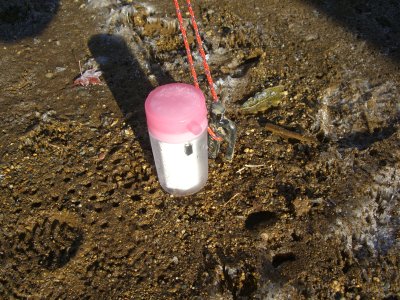 LED 自体の明るさは貧弱なのだがプラスチックのホヤとアルミテープ反射鏡のおかげでペグマーカーとしては十分実用的であることが確認できた。(もっとも、視認性の面では醤油さしをケースに使用した前作