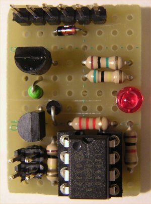 基板は醤油さしに入るよう、ユニバーサル基板を 9 x 14 孔に切り出して使用。この基板の中央には超高輝度赤
