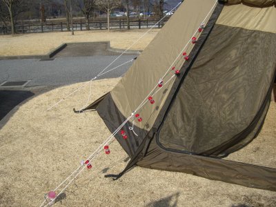 もともと 100均の醤油さしなので明るいところでの見てくれはイマイチ ^^;。だがキャンプに実戦投入してみたところペグの位置がよく判るようになり、転倒防止装置という本来の役目は十分に果たしてくれた。なかなか実用的なので現在量産中。