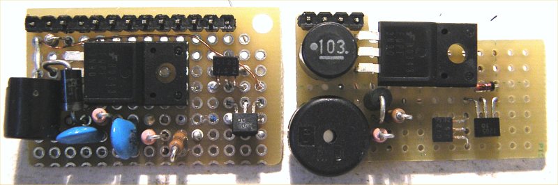 | 高圧回路の実装例 左:ノイズが抑え込めた成功品 右:ノイズが取れなかった失敗例 ユニバーサル基板での実装は注意が必要 |