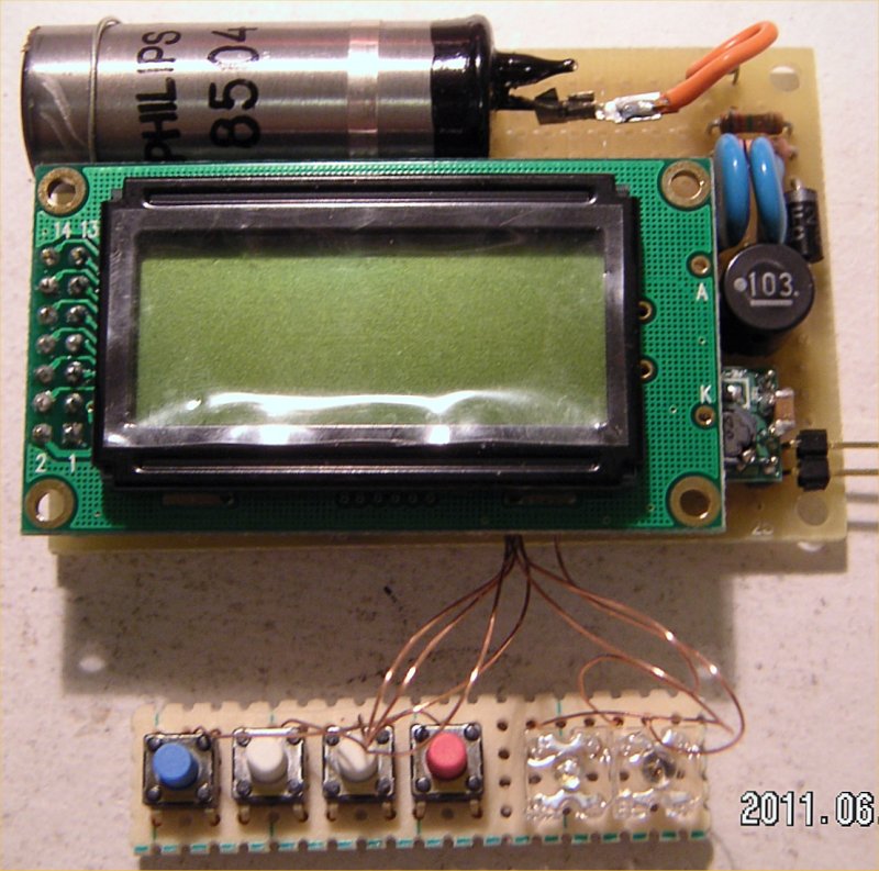 ガイガーカウンターは GM管に高圧を供給し、発生したパルスをカウントするだけという至極簡単な仕組み。ただしこの高圧発生部がクセモノで、普通のテスターやオシロプローブでは電圧が降下して正確な電圧が測れない。ちゃんと測定するには