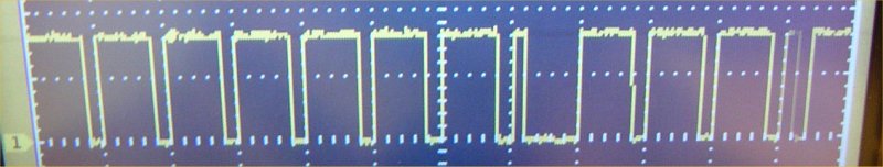 で、通常 PIC でパルス幅を計るとなるとキャプチャ機能を使うのが最も一般的だろう。まぁ、確かにそれでも動く。規格通りの綺麗な信号だけが送られてくるならば。実際、茨城の管理人宅は室内でも受信状態は極めて良好で、写真のような非常に綺麗な信号が受信できる。実際にキャプチャでパルスを判断するプログラムを組んで確かめたところ、電波状況が良い場所ならこの方法でも時刻をデコードできることは確認できた(まぁ、当たり前のハナシだ)。
