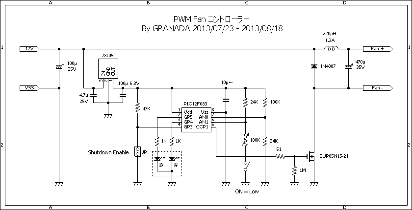 注意点は PIC のパスコン。電気喰いのファンを PWM でスイッチングするため、一般的な