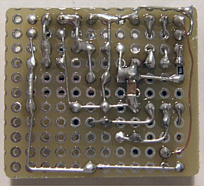 | 基板裏 | 制御回路実装の様子。 基板と 2色 LED は ホットボンドで固定。 |