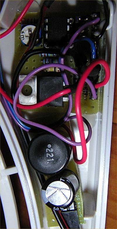 | 平滑部実装の様子 | 外部電源入力まわり。 ホットボンドで固定。 |