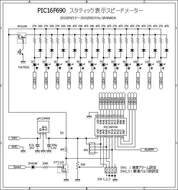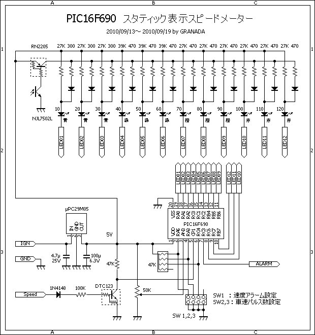 PIC には 16F690 を使用し、LED は 10Km/h 刻みで 12個とする。余ったポートは車速パルス設定、警告速度設定用、表示速度補正用とする。