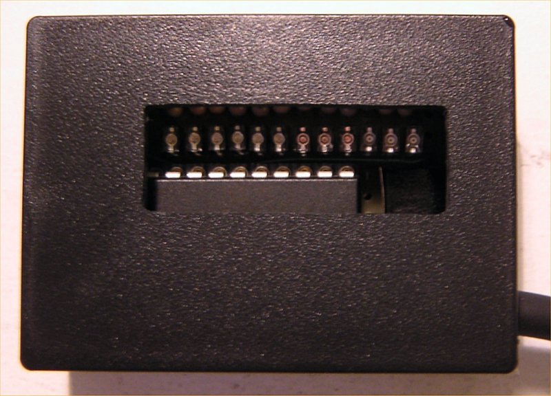 ケースにはタカチの超難燃性 ABS ケース SW-T55 (W40 x H20 x D55) を使用してかなり小型に仕上げた。これをフロントガラスにできるだけ近づけて設置した(写真参照)。LED の輝度が十分なので、炎天下でも Head Up Display (HUD) で十分に視認できる。