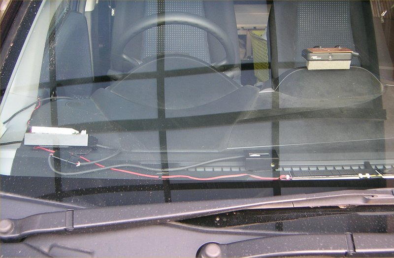 設置の様子(写真中央) 明るさ検出孔のせいで一見ドライブ レコーダーのようにも見える ^^; |