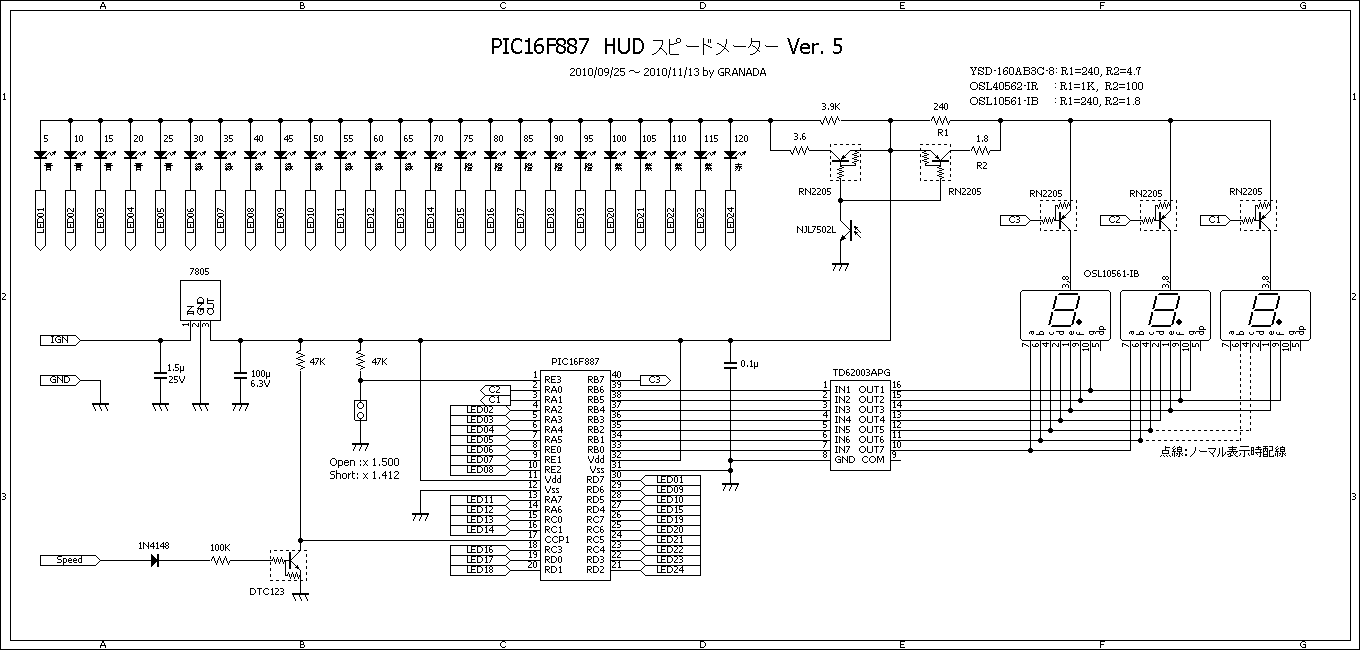 消費電流削減(=三端子レギュレーターの発熱低減)と部品点数削減のため、完全ダイナミック点灯(桁内もダイナミック点灯)とする。LED が最も多く点灯するのは 128Km 時で、7セグ LED 側 14個、バー LED 側 24個で合計 38 個と多め。加えてピンク LED は点灯時間を長めにして輝度を確保している関係上、点灯タイミングはかなりシビアに(汗)。目が良いヒトなら多少チラつきが判ってしまうかもしれないが、運転中にマジマジと見つめるものでもないのでそこらへんは妥協する。