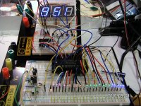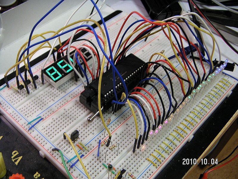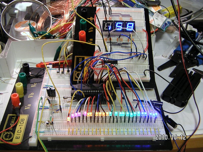 もちろん安易にシステムクロックを落とすよりも、TMR1 オーバーフローをさらに 8bit カウンタで管理(自前のソフトウエア・ポストスケーラーですな)したり、あるいは 7 セグ LED かバー LED のどちらかをスタティック点灯にして表示に必要な処理速度を節約するのがまっとうな対処方法デス ^^;