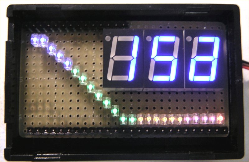 そこで体感速度と LED 表示との間に違和感が生じないよう、バー LED は指定値を中央値として ±2Km/h で点灯させることにした。(つまり 70Km/h LED は 68〜72Km/h で点灯、75Km/h LED は 73〜77Km/h で点灯)