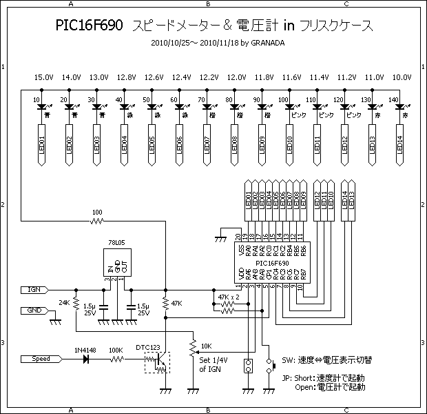 ただ今回は LED 14個で電圧表示をする関係上、電圧を全て均等に分割して表示すると使い勝手がイマイチ。そこで 10V, 14V, 15V は 1V 刻み点灯とし、最も分解能が必要な 11V 〜 13V を 0.2V 刻みとすることで実用性を高める。