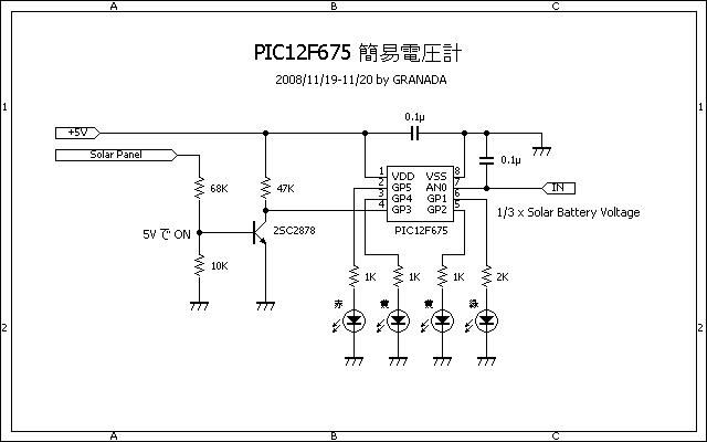 LED を1つ減らす代わりに鉛電池側の電圧も測定し、太陽電池側電圧と鉛電池電圧(満タン具合)を交互に表示するのも実用的かもしれない(表示パターンを工夫しないとわかりづらくなるかな?)。