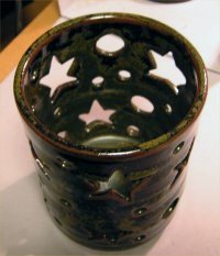 今回の製作に至った発端は、クリスマスに配偶者が LED キャンドル(ホームセンターとかで数百円で売ってるやつね)を買い求めたことであった。普段、管理人の製作物にはまったく興味を示さない配偶者が光モノに興味を示すとは点数を稼ぐ絶好のチャンス。速攻でプロトタイプ(写真参照)を作って配偶者の反応をうかがいつつ(汗)、発展型の製作を目論んでいたところ、都合よく笠間焼のキャンドルホルダーが手に入ったので、本格製作することに。