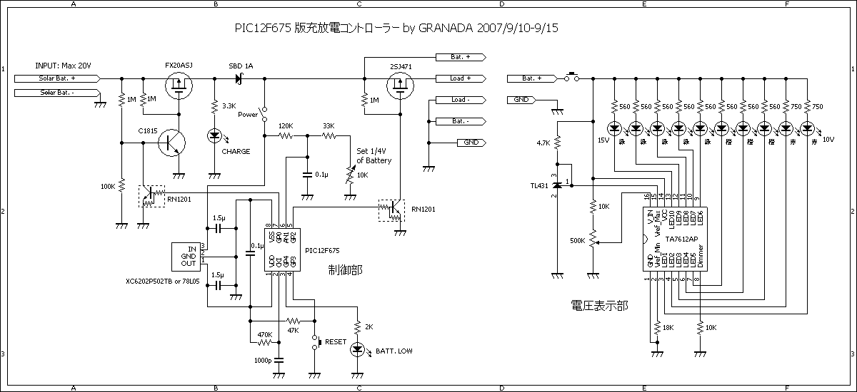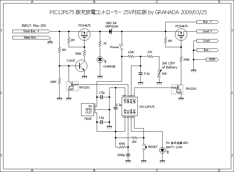 本プログラムを基に、充電専用コントローラーを製作。電源を太陽電池側から取るので、電池過放電の心配が無いのがウリ。詳細はこちら。