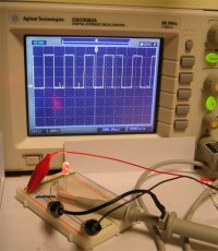 | おまけ: 自己点滅 LED の消費電流調査の様子 (2.5Hz、デューティー比 1:1、定格2V の模様) 消灯時はほとんど電気を食わないことが 確認できたので採用 |